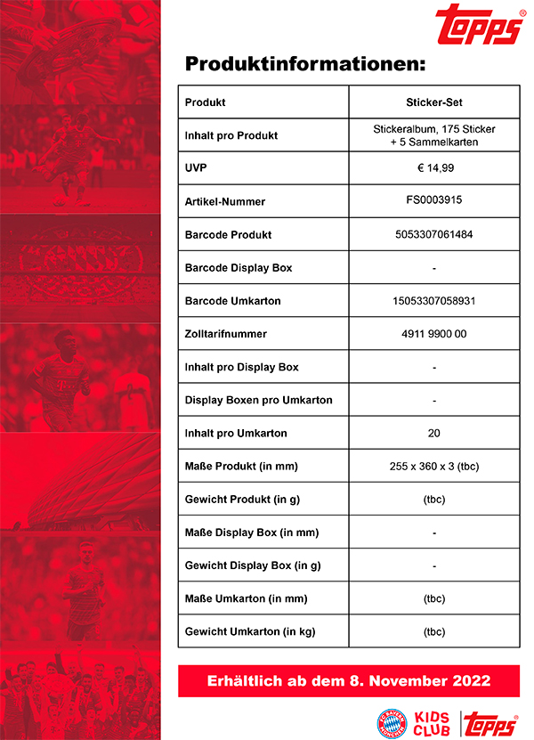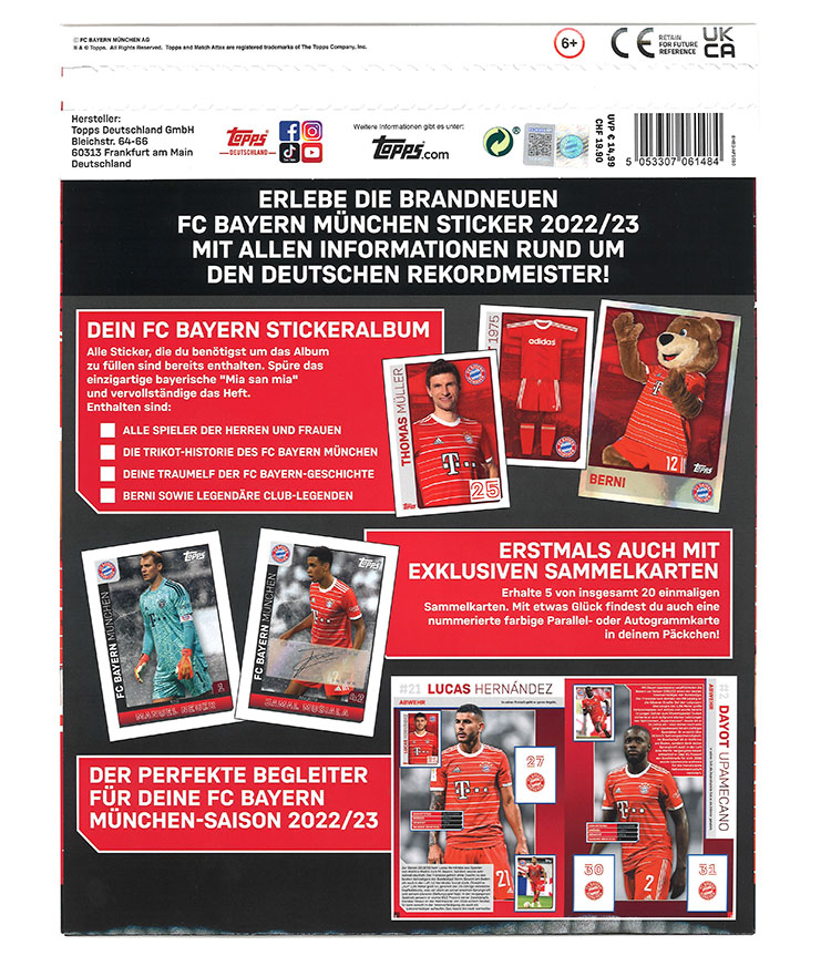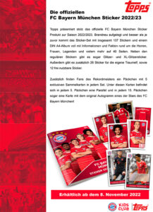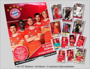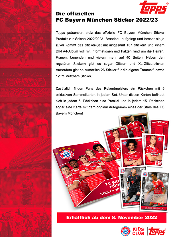 Topps präsentiert das offizielle FC Bayern München Sticker Produkt zur Saison 2022/2023. Brandneu aufgelegt und besser als je zuvor kommt das Sticker-Set mit insgesamt 137 Stickern und einem DIN A4-Album voll mit Informationen und Fakten rund um die Herren, Frauen, Legenden und vielem mehr auf 40 Seiten. Neben den regulären Stickern gibt es sogar Glitzer- und XL-Glitzersticker. Außerdem gibt es zusätzlich 26 Sticker für die eigene Traumelf, sowie 12 frei nutzbare Sticker.