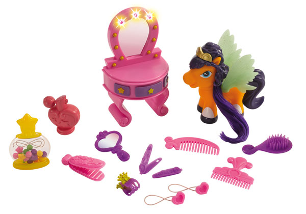 Großes Friseur-Set: Frisiertisch mit LED-Licht, Haarschmuck, Filly ZOEDA mit Glow in the Dark Flügeln, viel Zubehör. Inkl. 1,5V LR41 Batterien