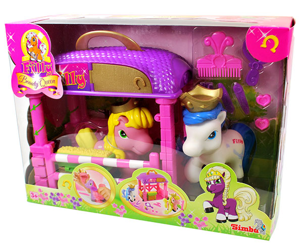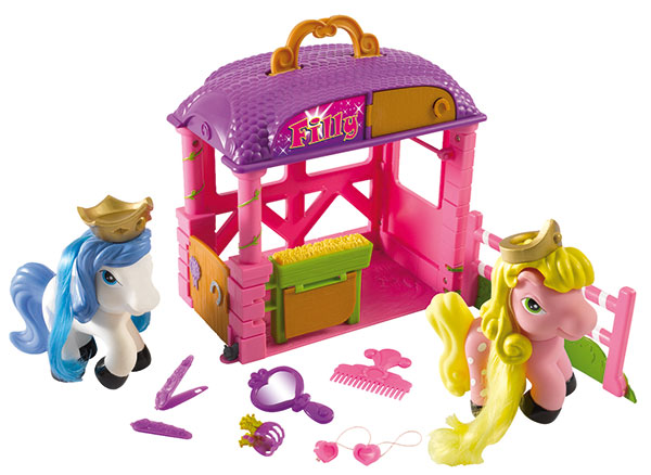 Pferdestall mit 2 Filly Einhörnern, 13 cm. Mit Haarschmuck und Zubehör. Stall mit verschiedenen Funktionen