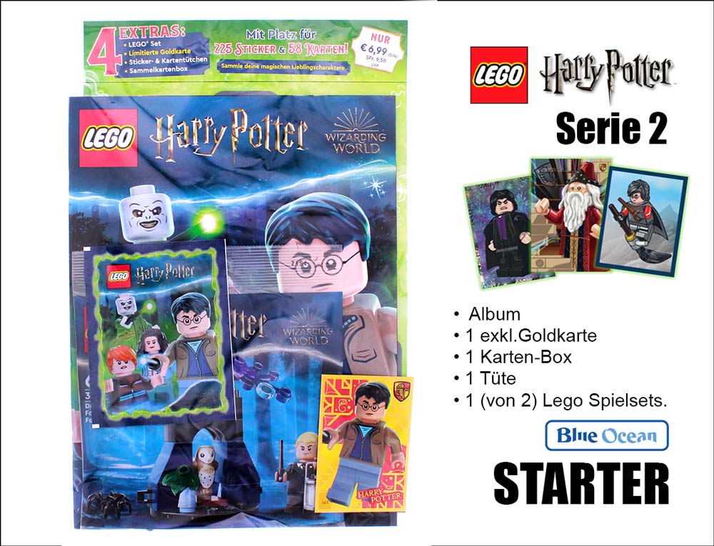 Sammelalbum + 1 exklusive Goldkarte + 1 Karten-Box + 1 Sammeltütchen + 1 (von 2) Lego Harry Potter XXL Extras.