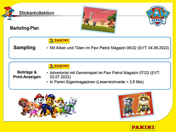 PAW Patrol ist die Top 1 Lizenzmarke im Vorschulbereich. Durchschnittlich schauen rund 387.000 Kinder am Tag PAW Patrol und der „PAW Patrol: Der Kinofilm“ stürmte im Sommer 2021 auf Platz 1 der Kinocharts! Von Juli bis Oktober 2022 soll die Live-arena Tour mit über 100.000 erwarteten Besuchern in Deutschland, Österreich und Schweiz stattfinden. Panini bringt eine weitere heldenhafte Stickerkollektion zum Erfolgsthema auf den Markt.