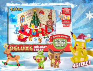 Verkürzen Sie die Wartezeit auf Weihnachten mit dem Pokémon Deluxe Adventskalender. Hinter den 24 Türchen verbergen sich exklusive Pokémon-Figuren und passendes Zubehör, die am Ende ein festliches Spielset ergeben. Das Pop-Up-Display mit Licht- und Soundeffekten sorgt für zusätzlichen Spielspaß.