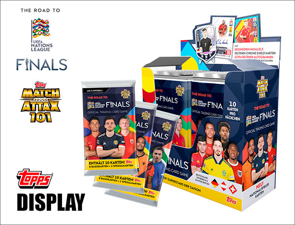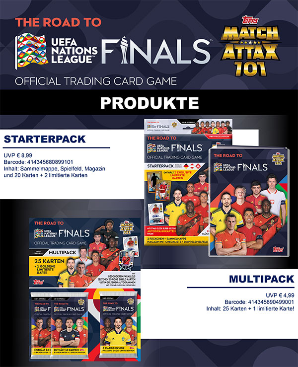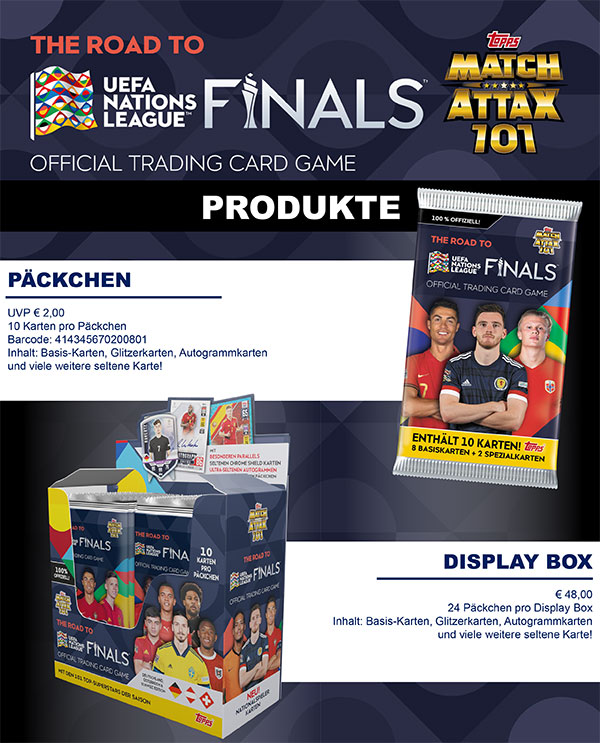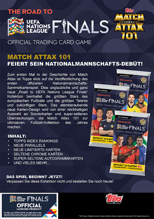 Zum ersten Mal in der Geschichte von Match Attax ist Topps stolz auf die Veröffentlichung des ersten offiziellen Nationalmannschafts- Sammelkartenspiel. Dies unglaubliche und ganz neue „Road to UEFA Nations League Finals“ Kollektion beinhaltet die größten Stars des europäischen Fußballs und die größten Talente und zukünftigen Stars. Das atemberaubende neue Karten-Design wird von einer reichhaltigen Auswahl an Sonderkarten und super-seltenen Überraschungen, die Match Attax 101 zur ultimativen Fußball-Kollektion des Jahres machen.
