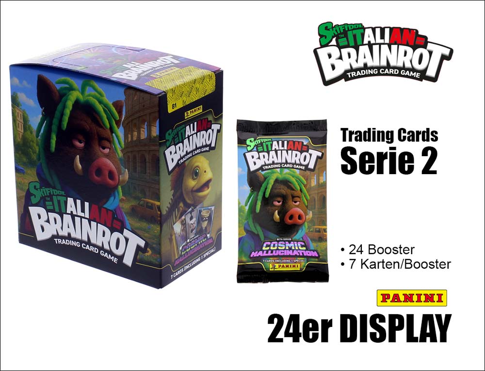 Das völlig verrückte Social Media Phänomen geht in die zweite Runde: Panini Skifidol Italian Brainrot – Serie 2: Cosmic Hallucination. Diese Trading Cards Kollektion ist laut, frech und absolut drüber. Sammeln Sie die verrücktesten Charaktere basierend auf viralen Internet-Trends (#brainrot).