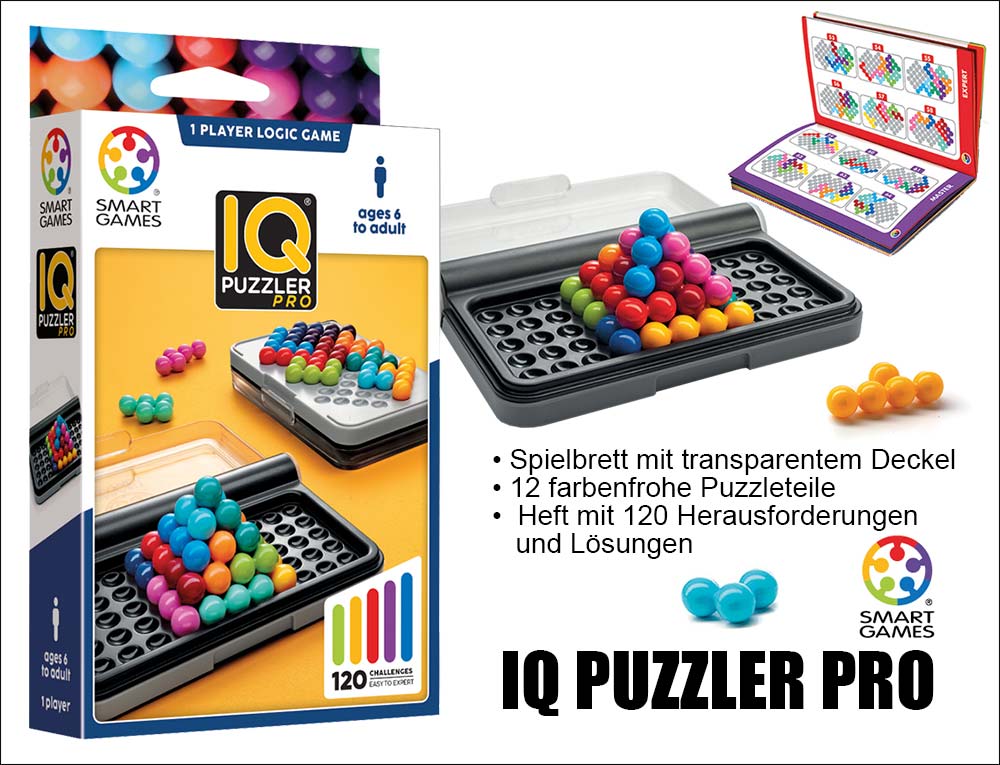 Der neue IQ Puzzler beinhaltet Aufgaben in verschiedenen Dimensionen. Alle Teile in einer Ebene unterbringen, oder vielleicht doch eine Pyramide bauen? Als dritte Variante kann man „diagonal“ legen. Alles in einer kleinen, handlichen Verpackung – ideal für die Reise.