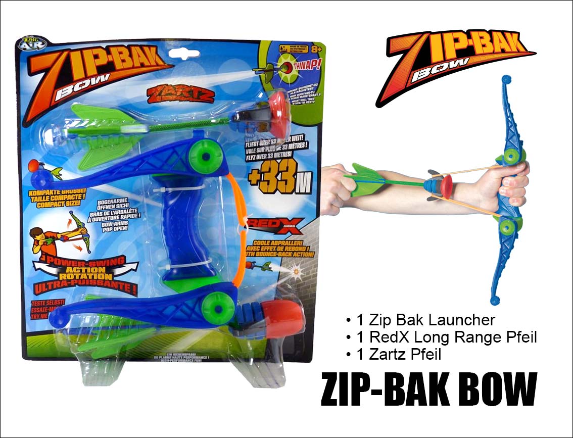 Der Zip Bak Launcher ist ein handlicher dank seiner umlenkfuntion der speziellen Gummibänder sehr wendiger Launcher. Seine 2 unterschiedlichen Pfeile können bis zu 30 Meter fliegen. Der Saugnapfpfeil klebt auf allen glatten Untergründen und fällt nach einigen Sekunden selbständig ab. Der Zip Bak ist für links und rechtshänder geeignet. Pfeil in die Gummibänder einhaken, Launcher anspannen und abschießen. Nur für außen geeignet.